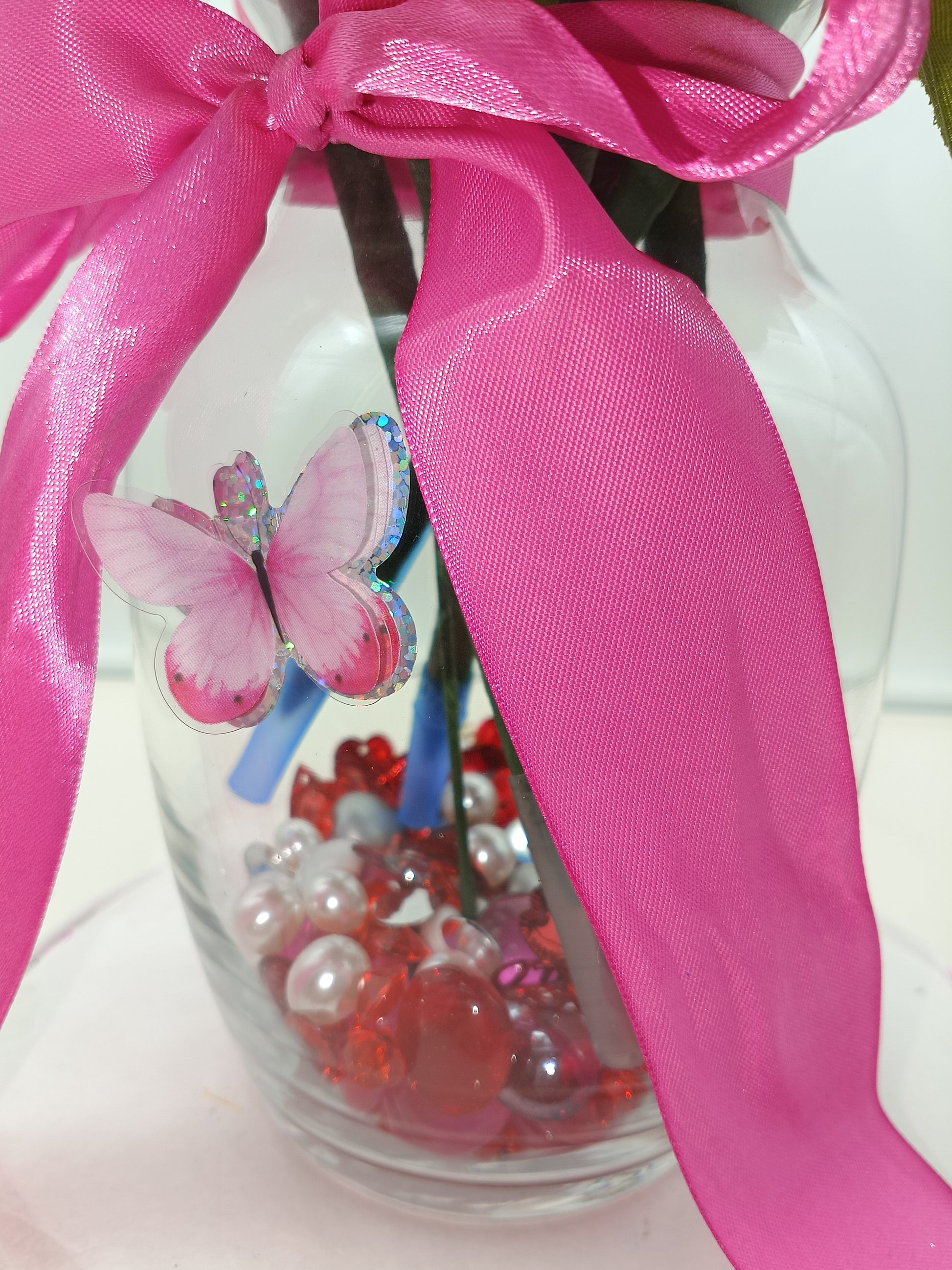 6ct pen arrangement (3 blue ink/3 black ink), glass vase