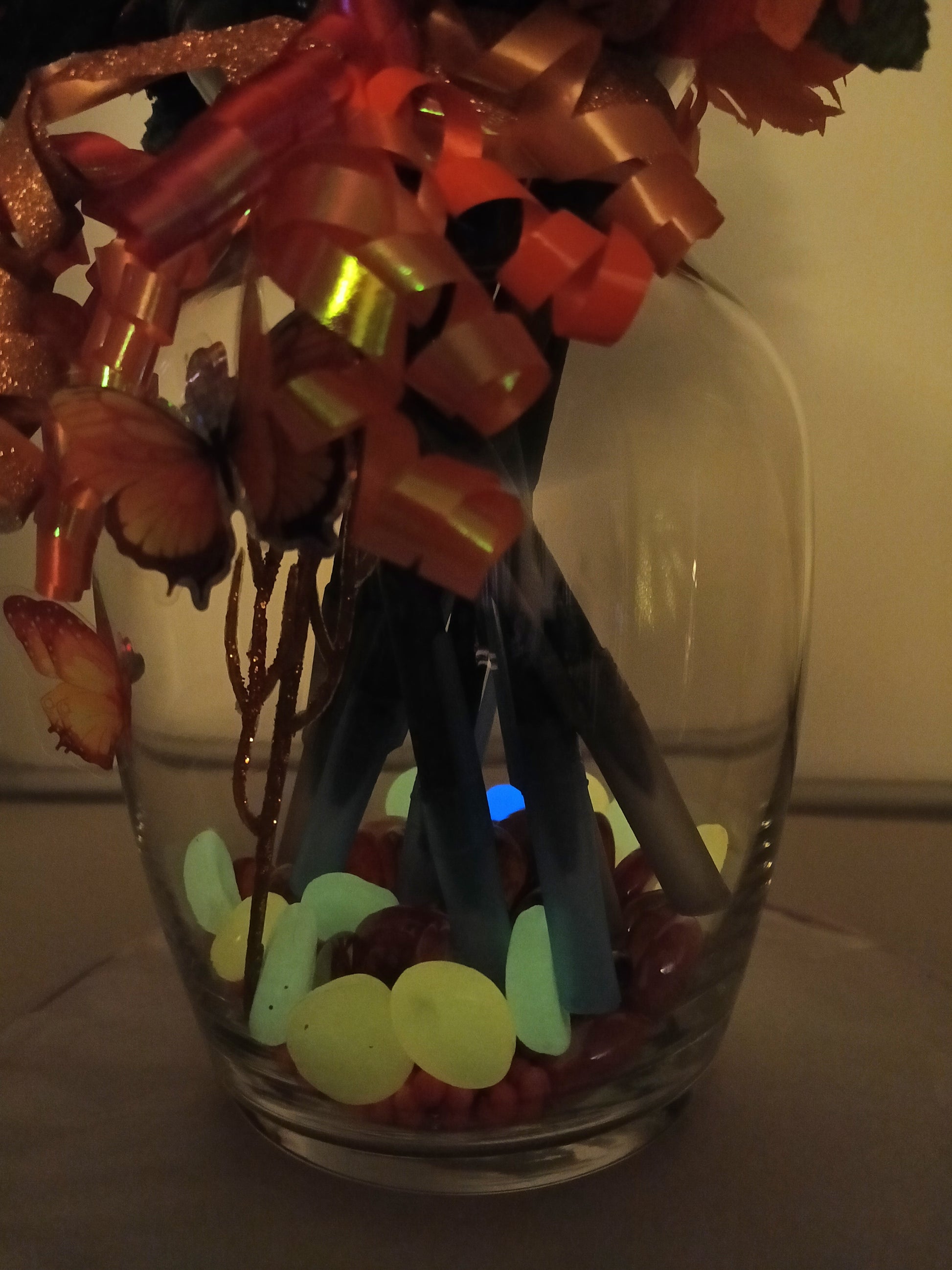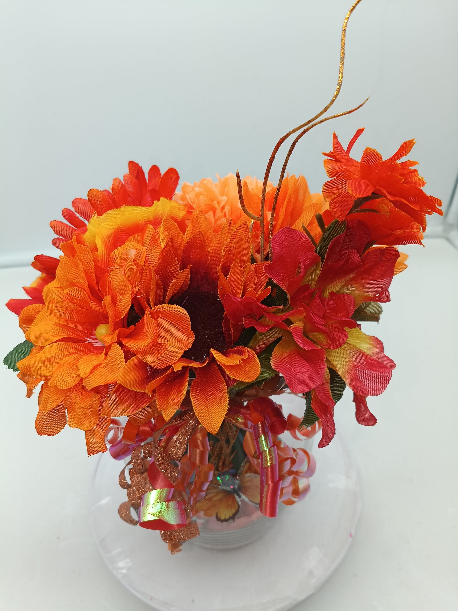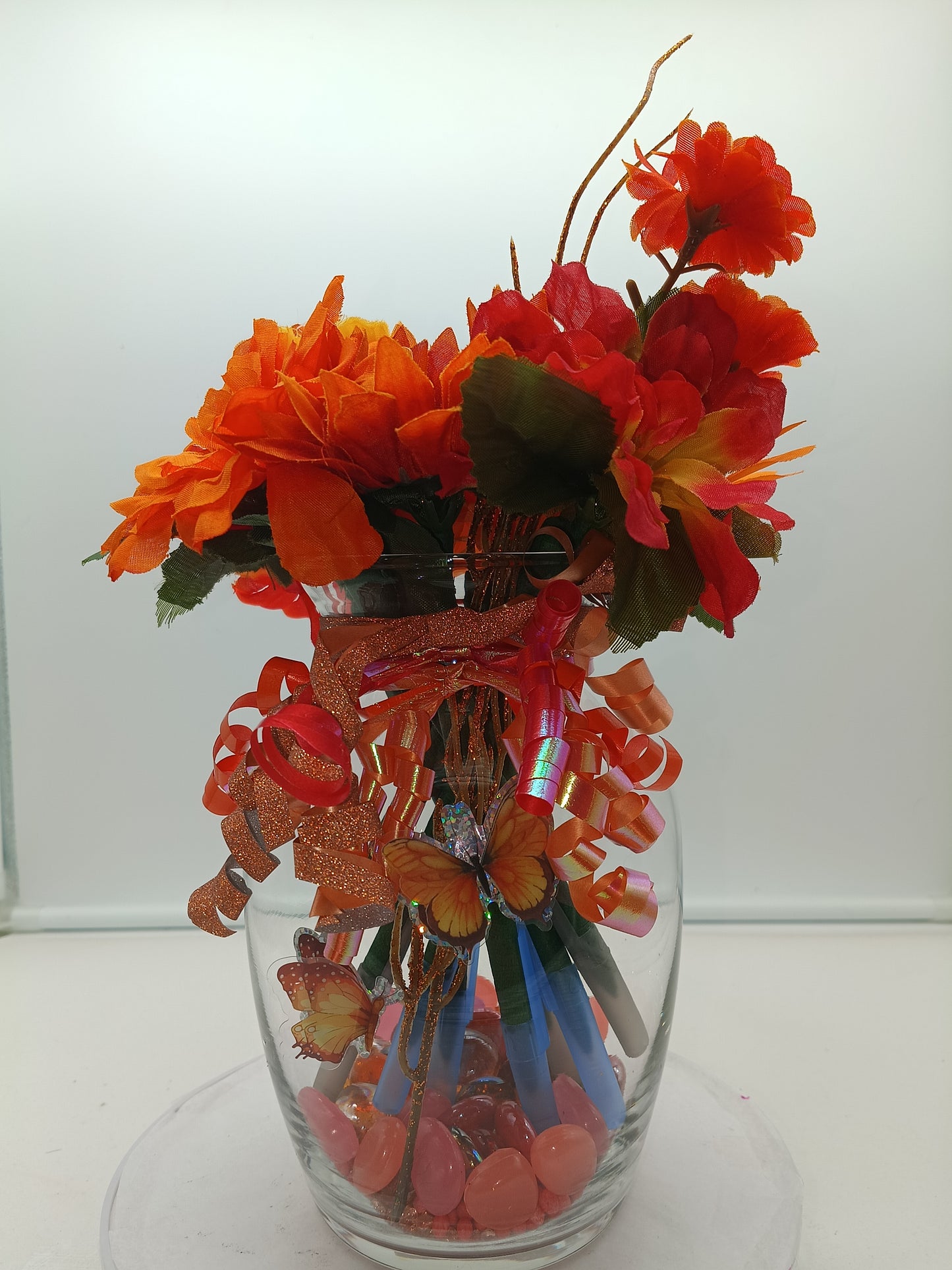 This stunning arrangement is elegant and classy. With a matching butterfly and glow gems added. ORANGE you gonna add this to your cart?