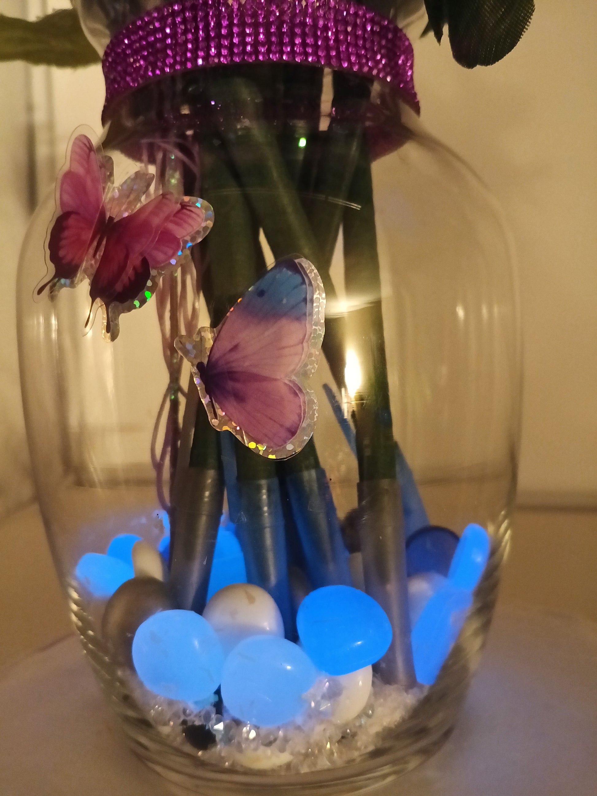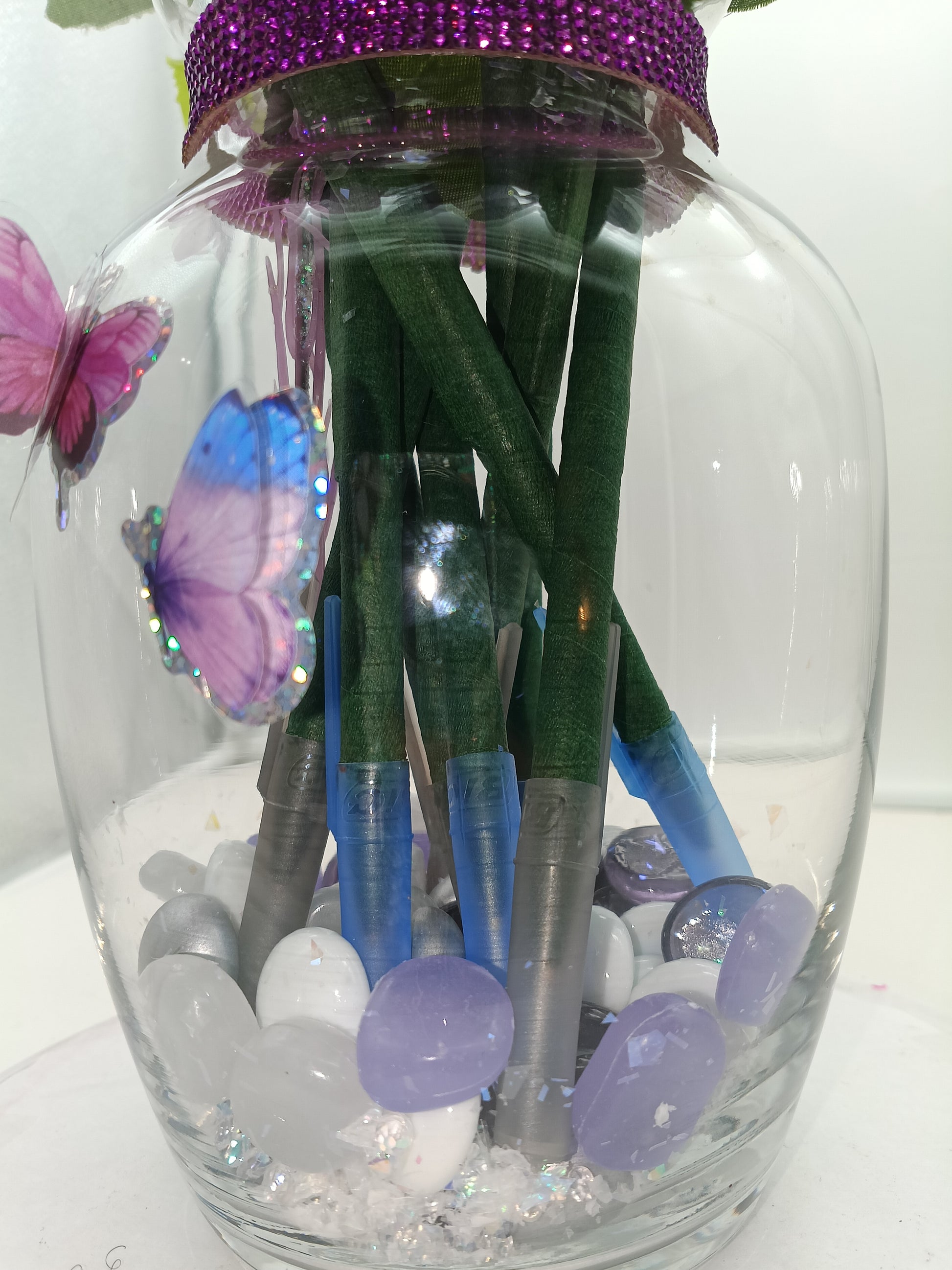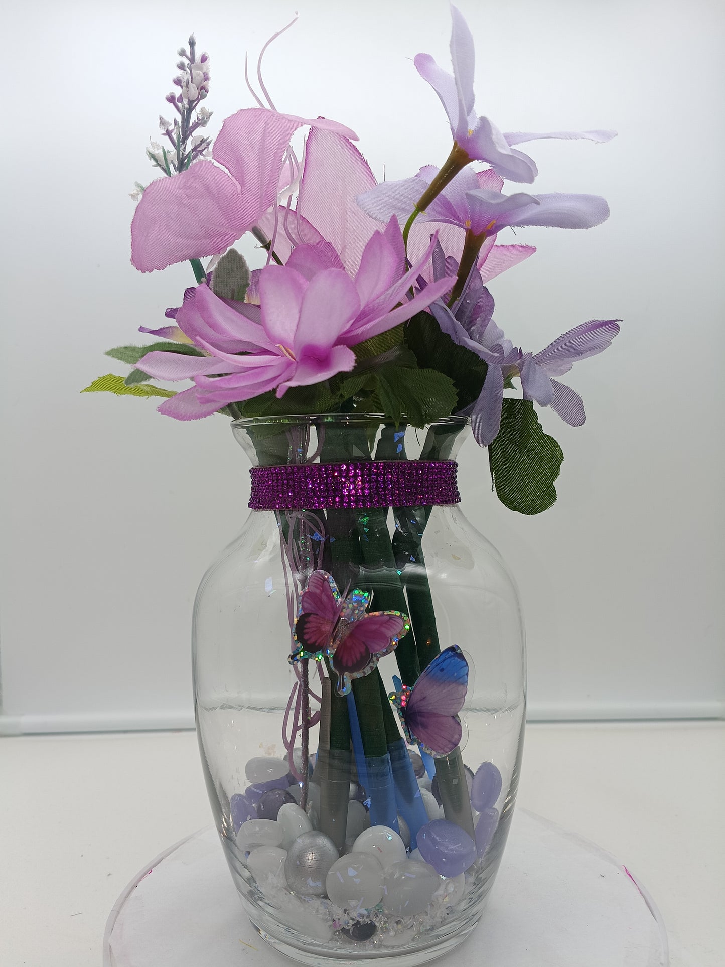 This dazzling arrangement has beautiful purple and blue tones. Cute little purple butterflies adorn its vase. Glow Gems added to make it shine bright, even at night!