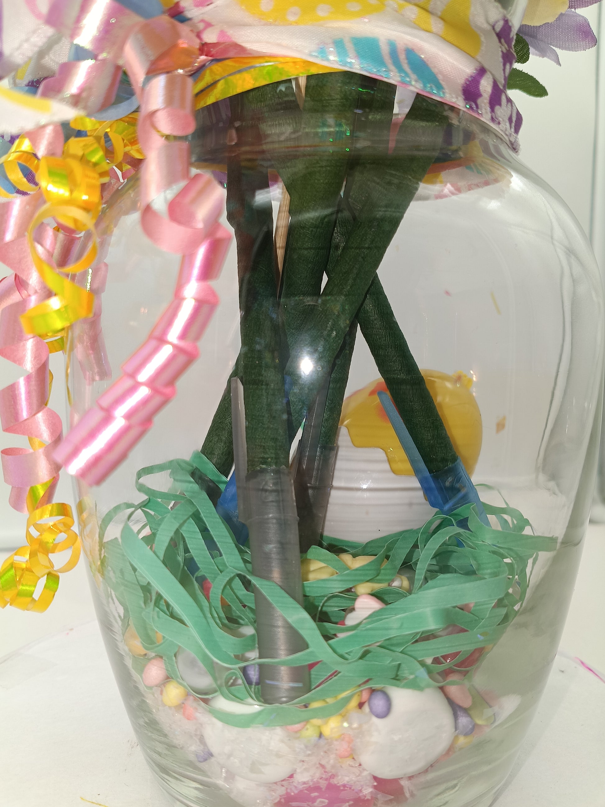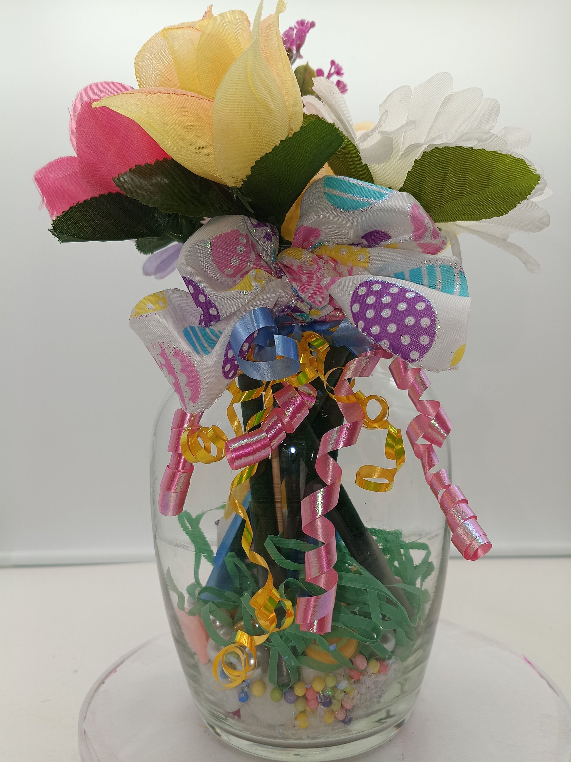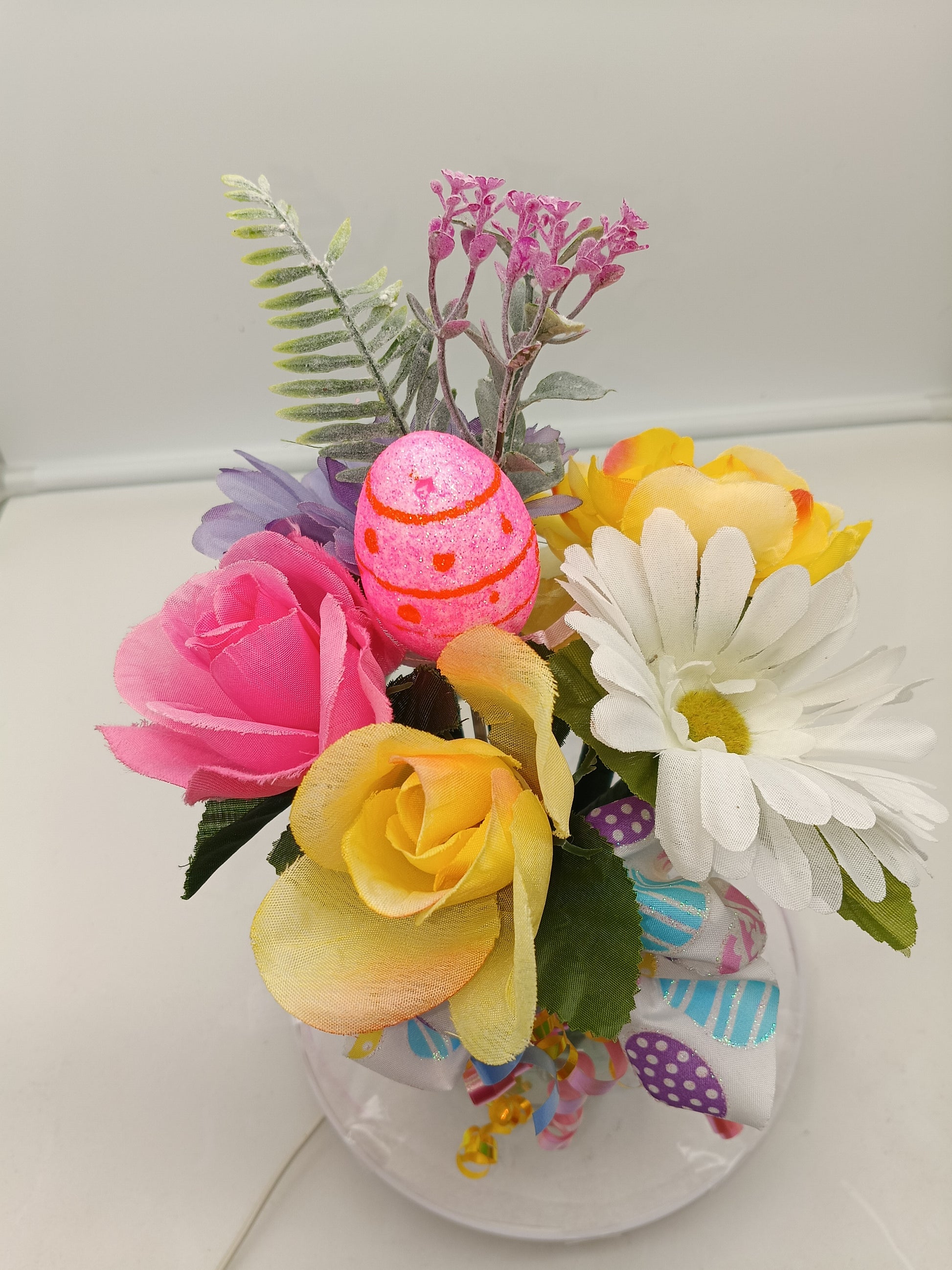 This arrangement will definitely put you in the Easter holiday spirit. It shines bright with its pastel colors. Also has a little chick filled with chocolate kisses.