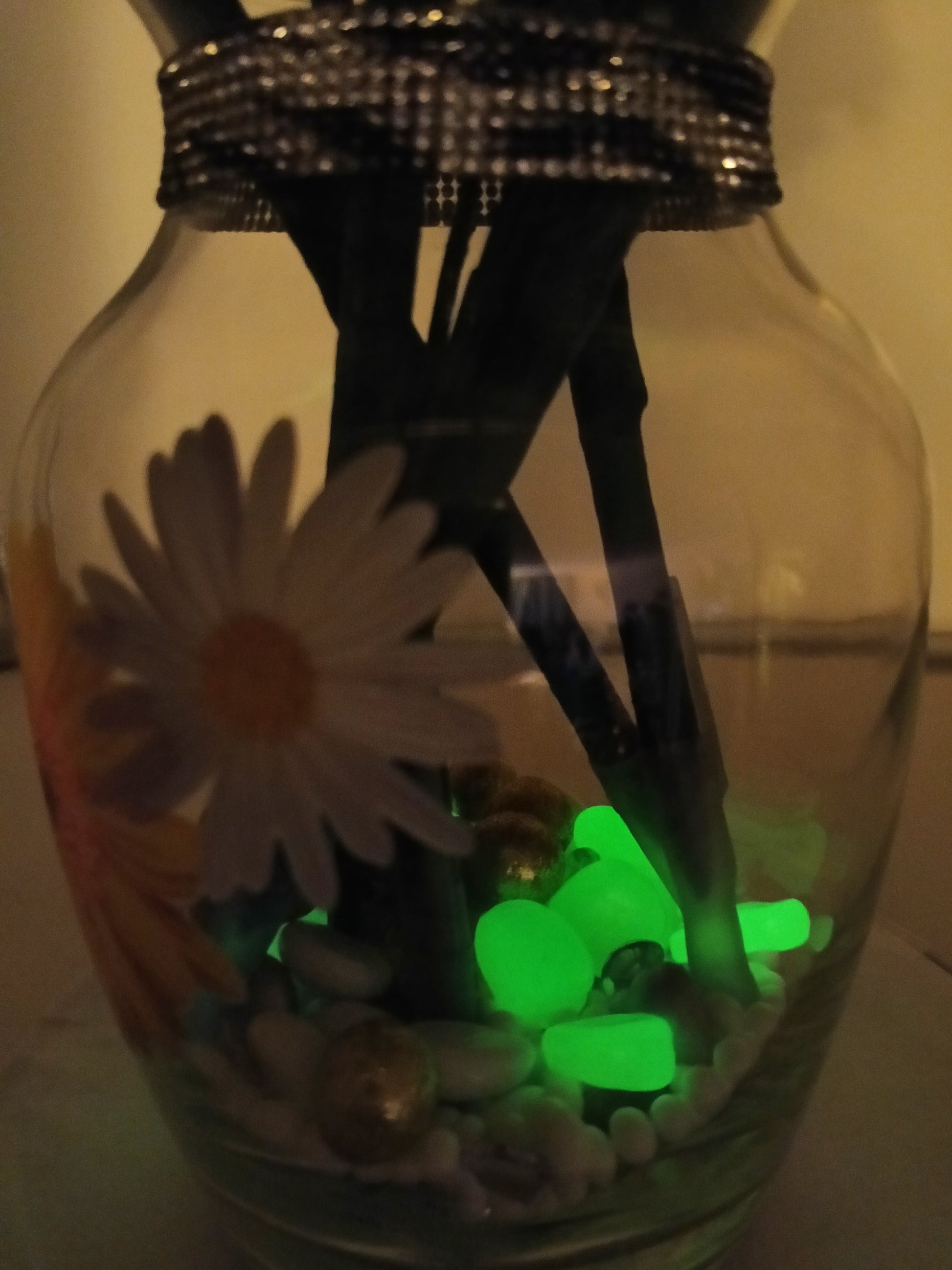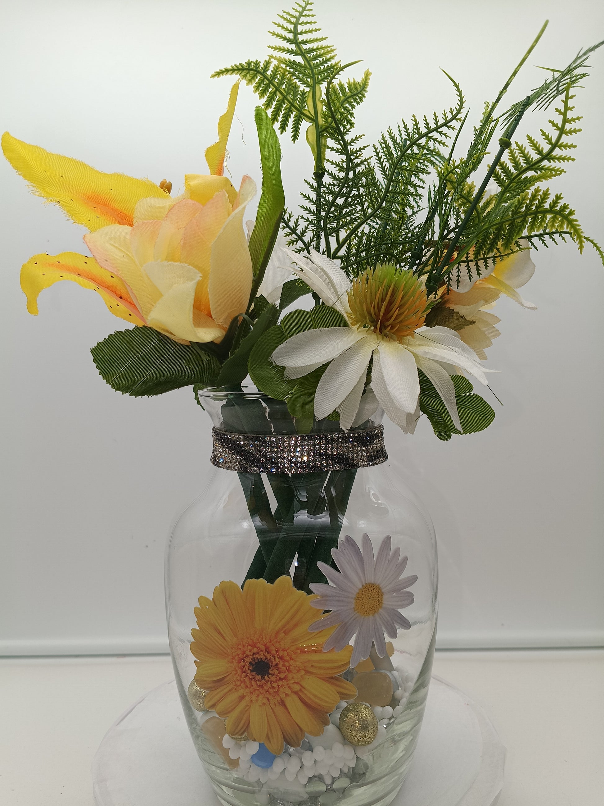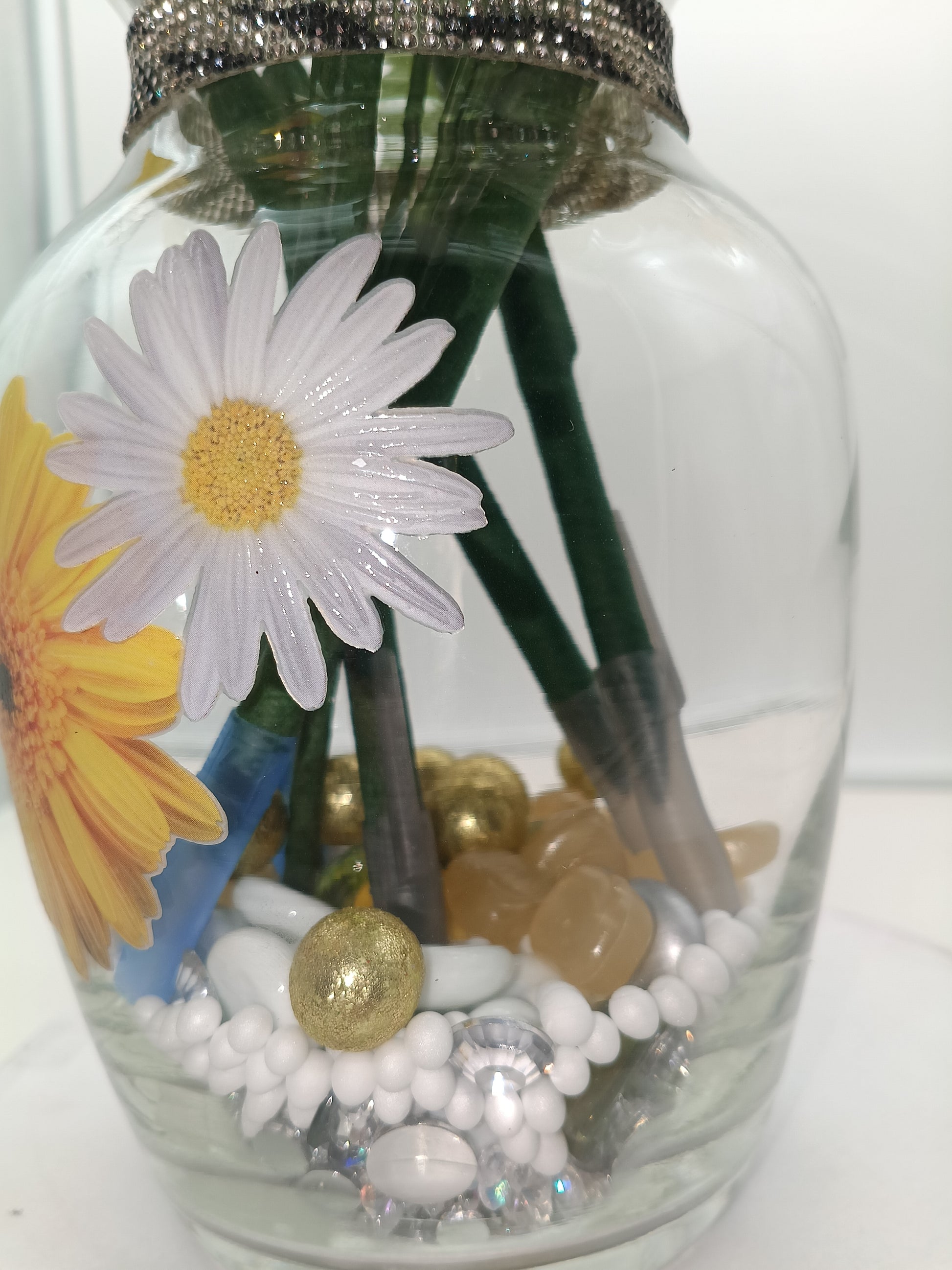 This arrangement is guaranteed to be the sunshine in that special person's life. It shimmers and shines with rhinestones, topped with glow gems. Vase is adorned with lovely flower stickers to match