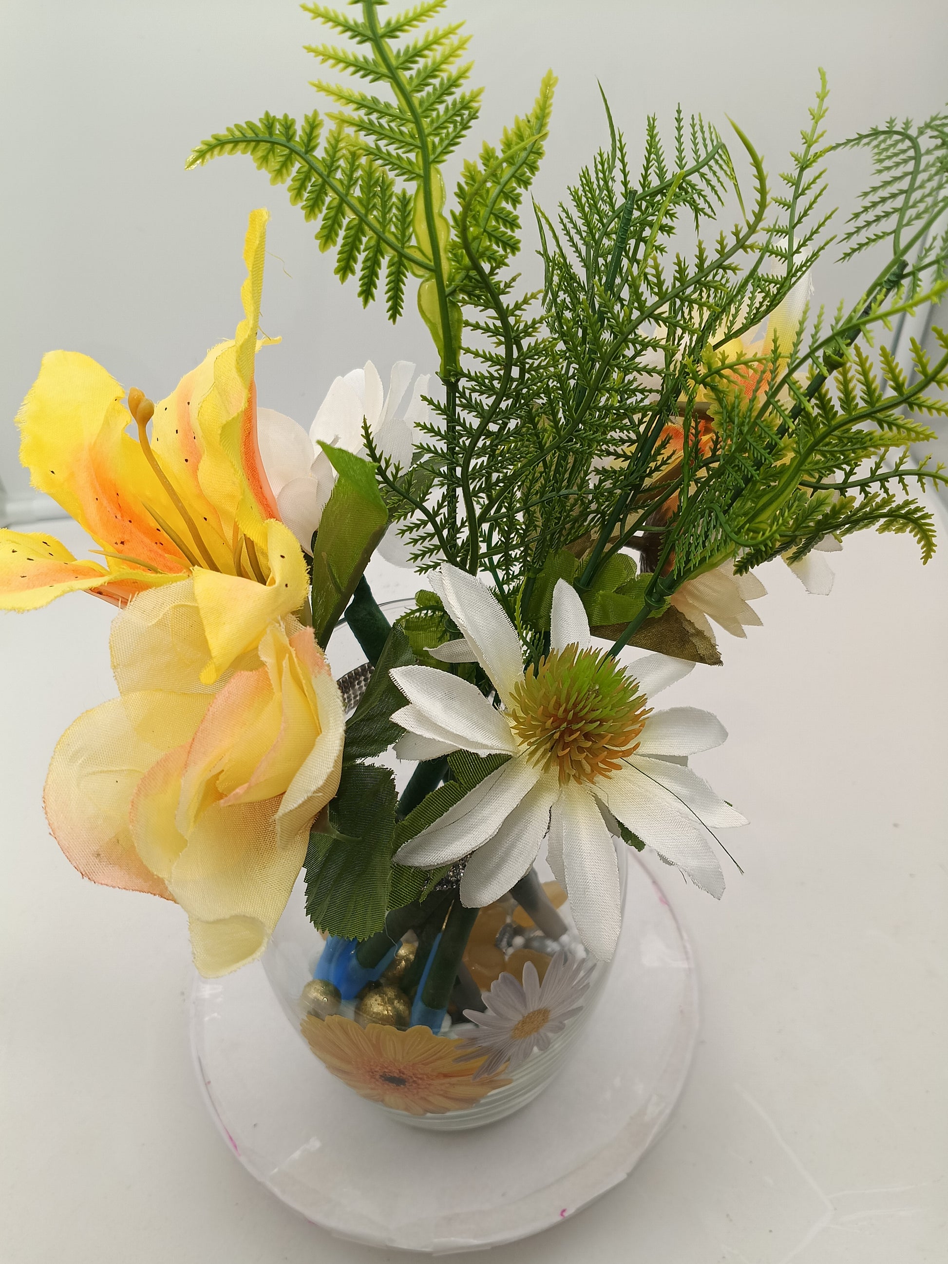 6ct pen arrangement (3 Blue ink/3 Black ink), glass vase